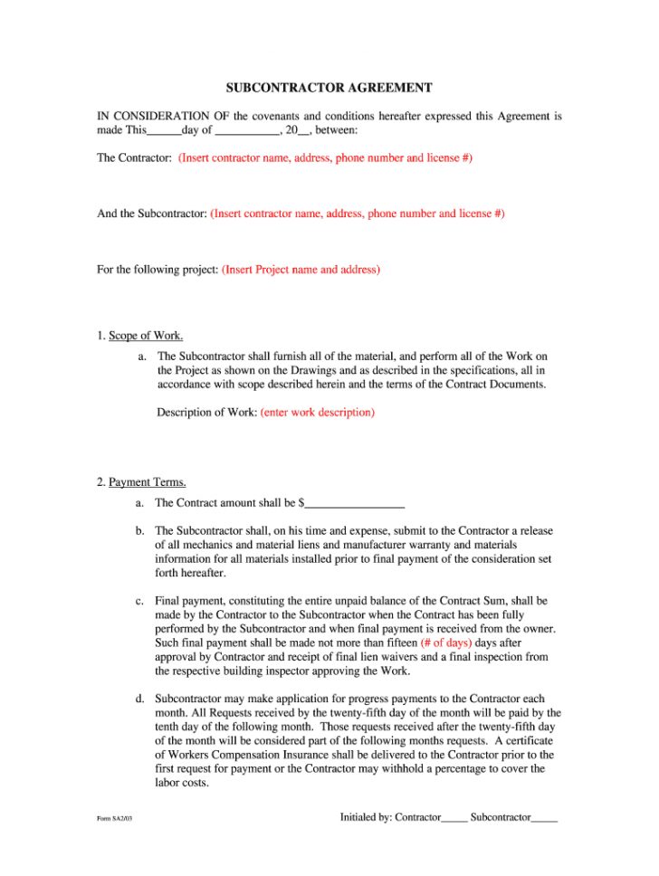Construction Subcontractor Contract Template Subcontractor Agreement