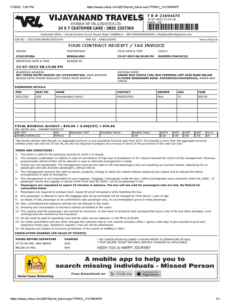 Tour Contract Receipt / Tax Invoice: TOTAL BOOKING AMOUNT: 850 00 0