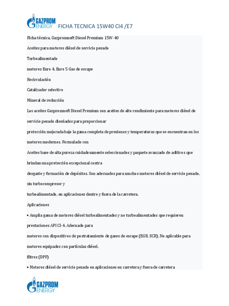 Ficha Técnica 15w40 GAZPROM PDF Turbocompresor Motor diesel
