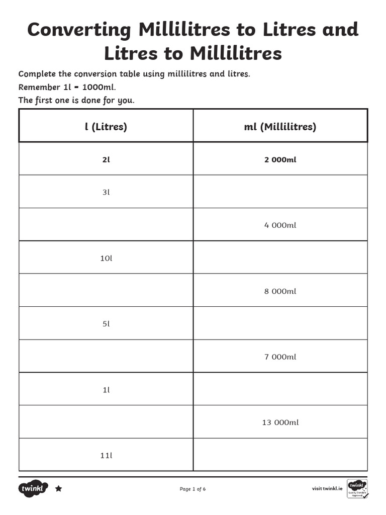 Converting litres to millilitres worksheet easy to print