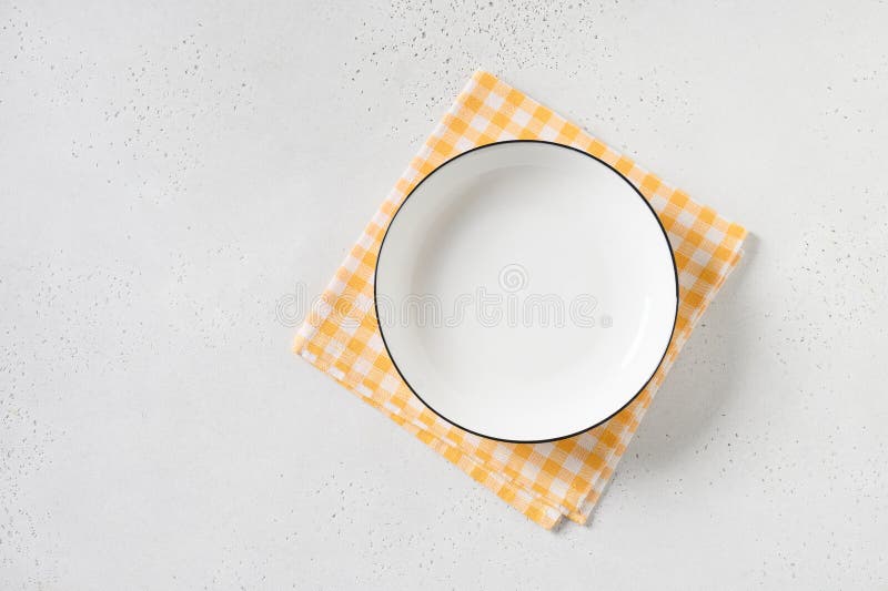 White Empty Plate with Yellow Checkered Towel on White Background