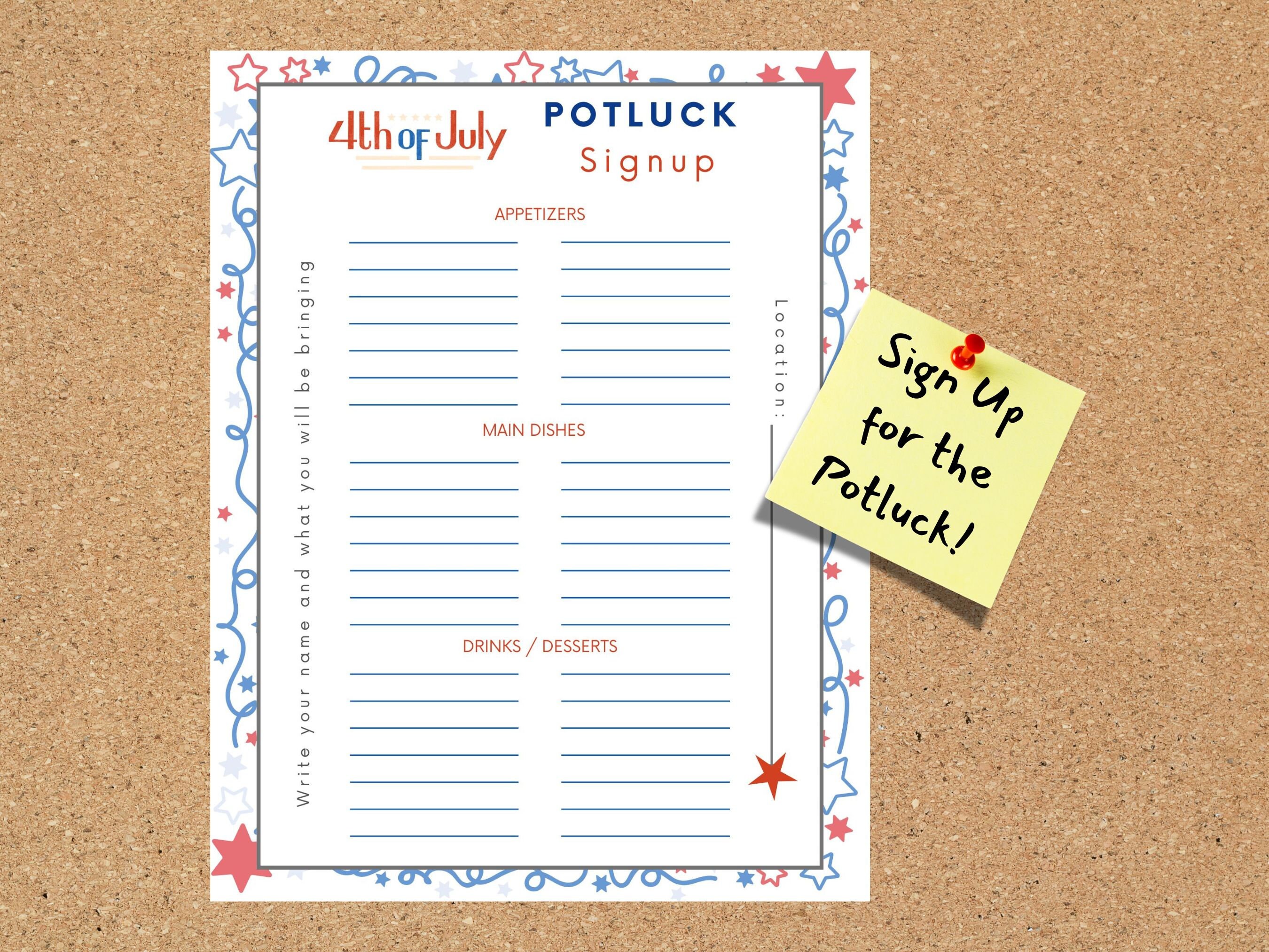 4th of July Potluck Sign up Sheet Summer Potluck Sign up Sheet