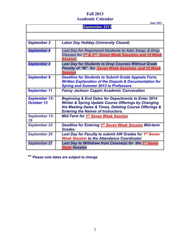 Coppin State Fall 2013 Academic Calendar PDF College Planning