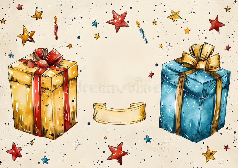 Watercolor Illustration of Gift Boxes with Stars and Candles Template