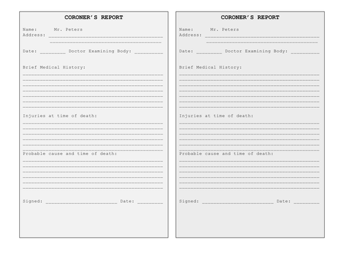 CSI Mr Peters a template for the Coroner #39 s Report Teaching Resources