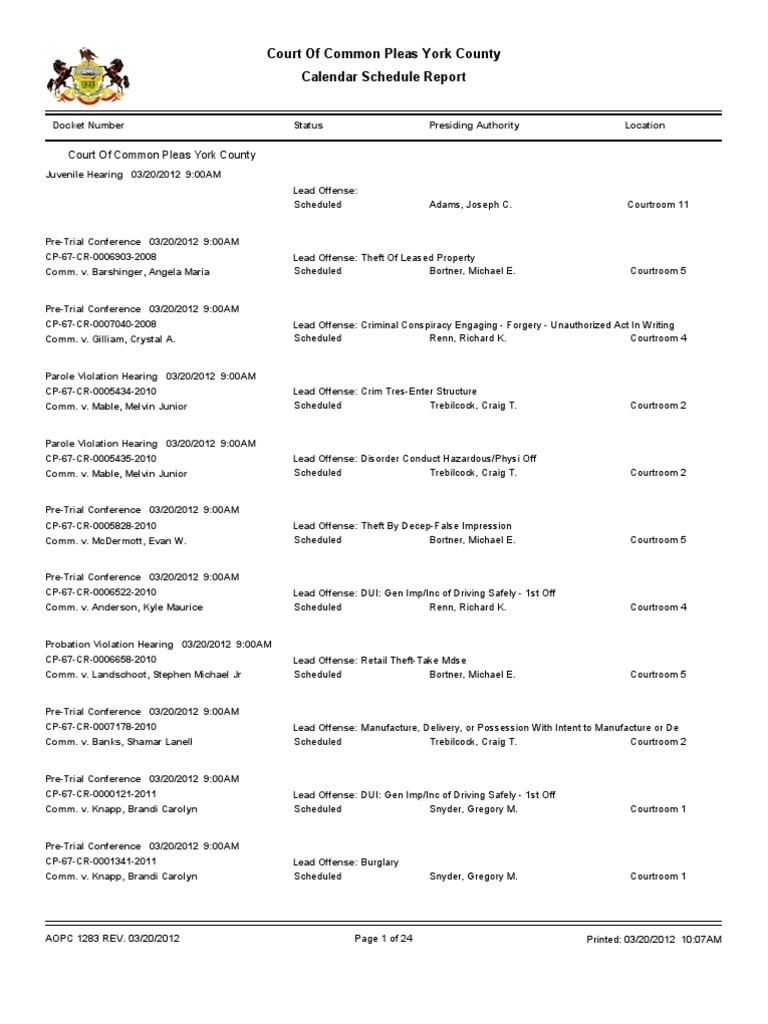 York County Common Pleas Court Docket 3 20 12 PDF Probation