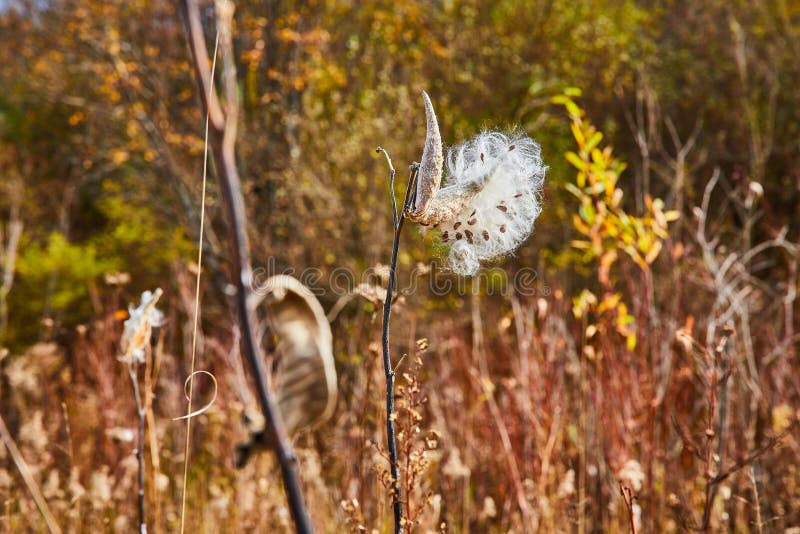 Milkweed Cotton Seed Pods Bursting Open in Late Fall in Detail Stock