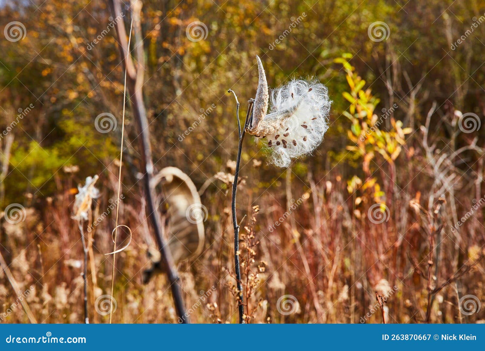 Fall Fields with Opening Patches of Milkweed Cotton Seed Pod in Focus
