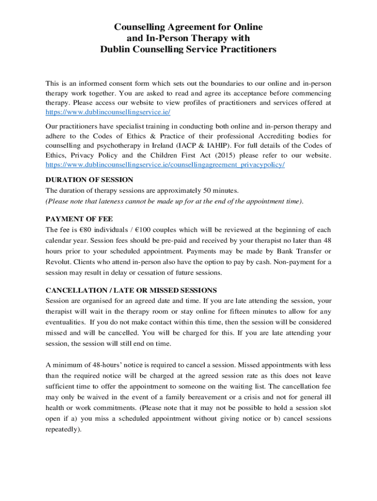 Fillable Online Counselling Agreement for Online and In Person Therapy