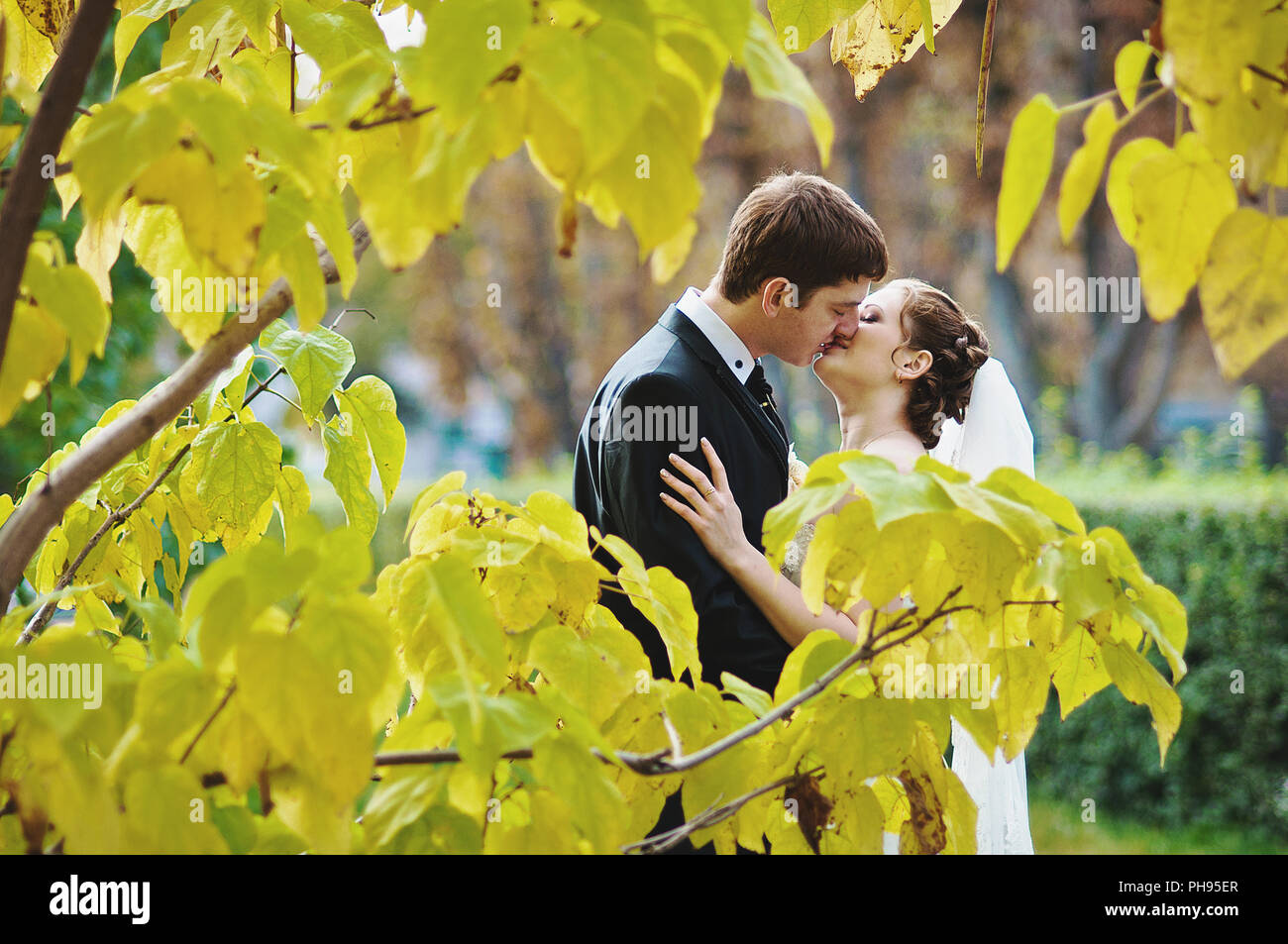 Kissing wedding couple background yellow leaves Stock Photo Alamy