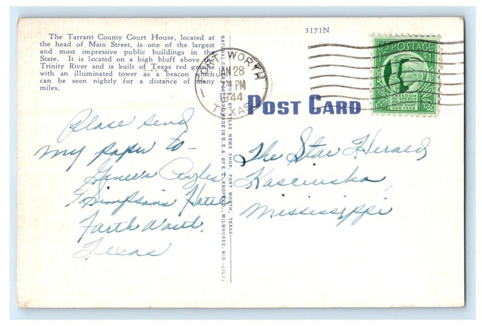 1944 Tarrant Country Court House Fort Worth Texas TX Posted Vintage