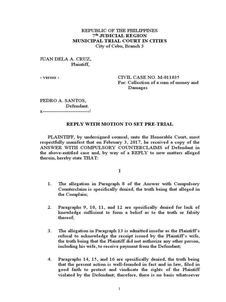 Sample Reply to Answer with Counterclaims Lawsuit Government
