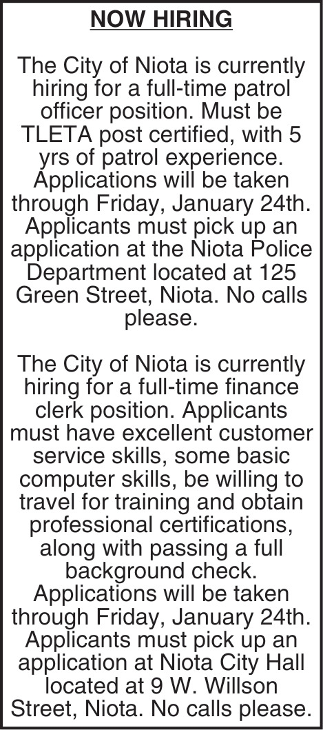 Patrol Officer Position City Of Niota Niota TN