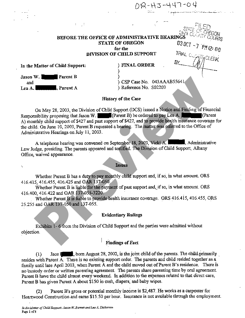 Oregon Final Order of Establishing Paternity Custody Parenting Time