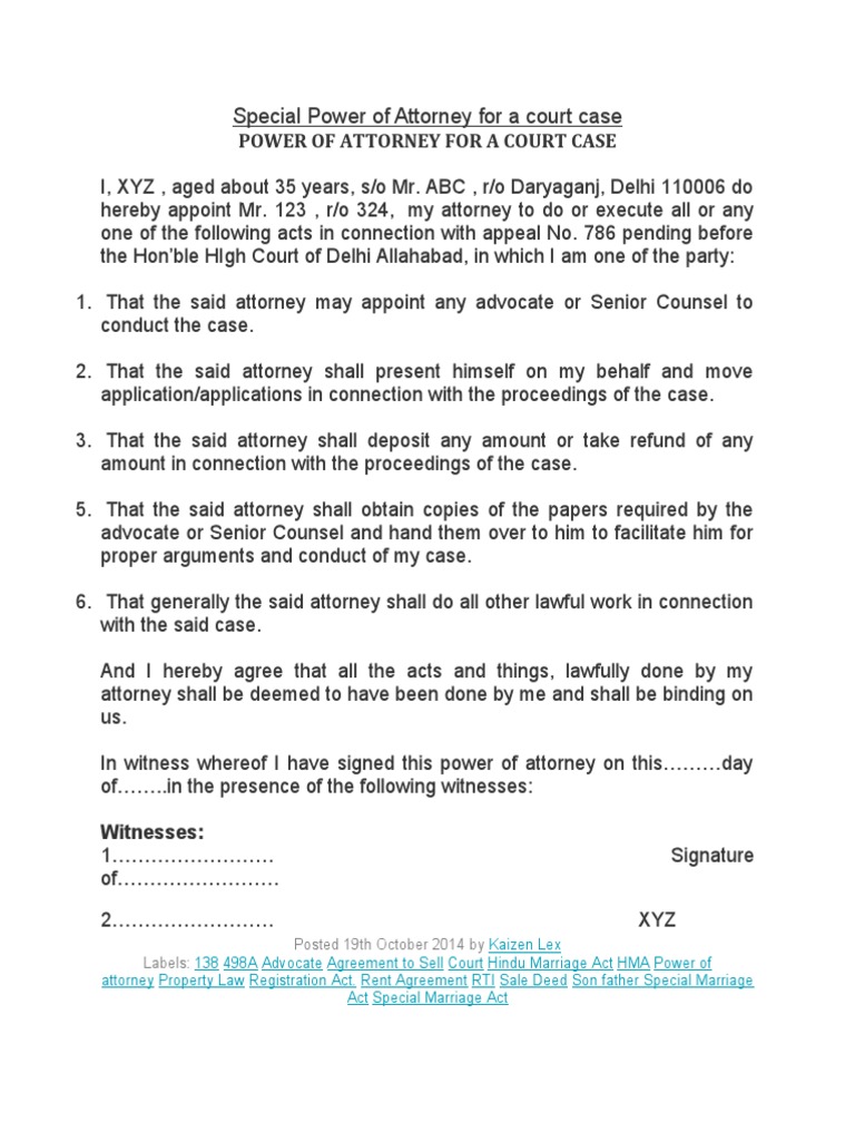 Special Power Of Attorney To Represent In Court