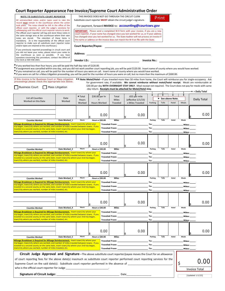 West Virginia Court Reporter Appearance Fee Invoice/Supreme Court
