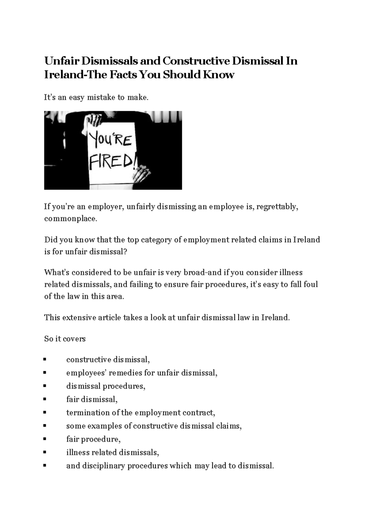 Unfair Dismissals and Constructive Dismissal In Ireland Unfair