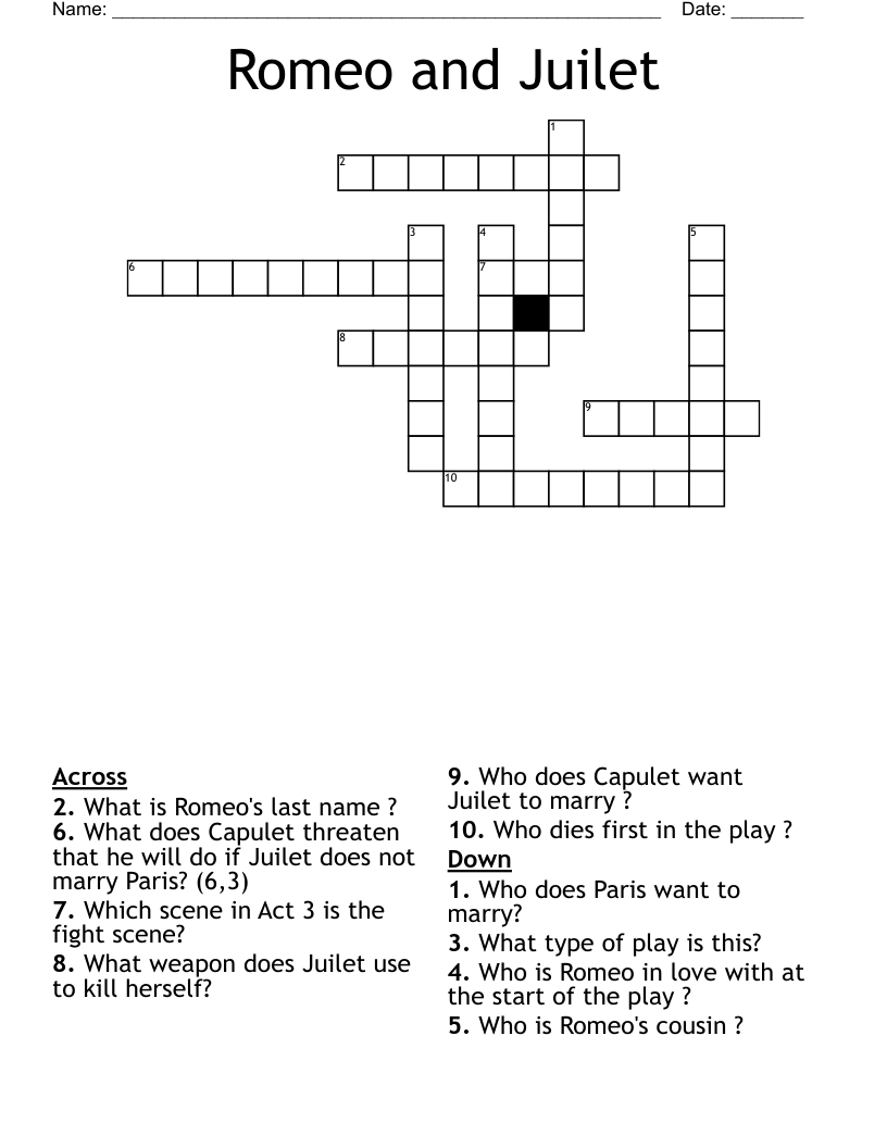 Romeo and Juliet Crosswword Crossword WordMint