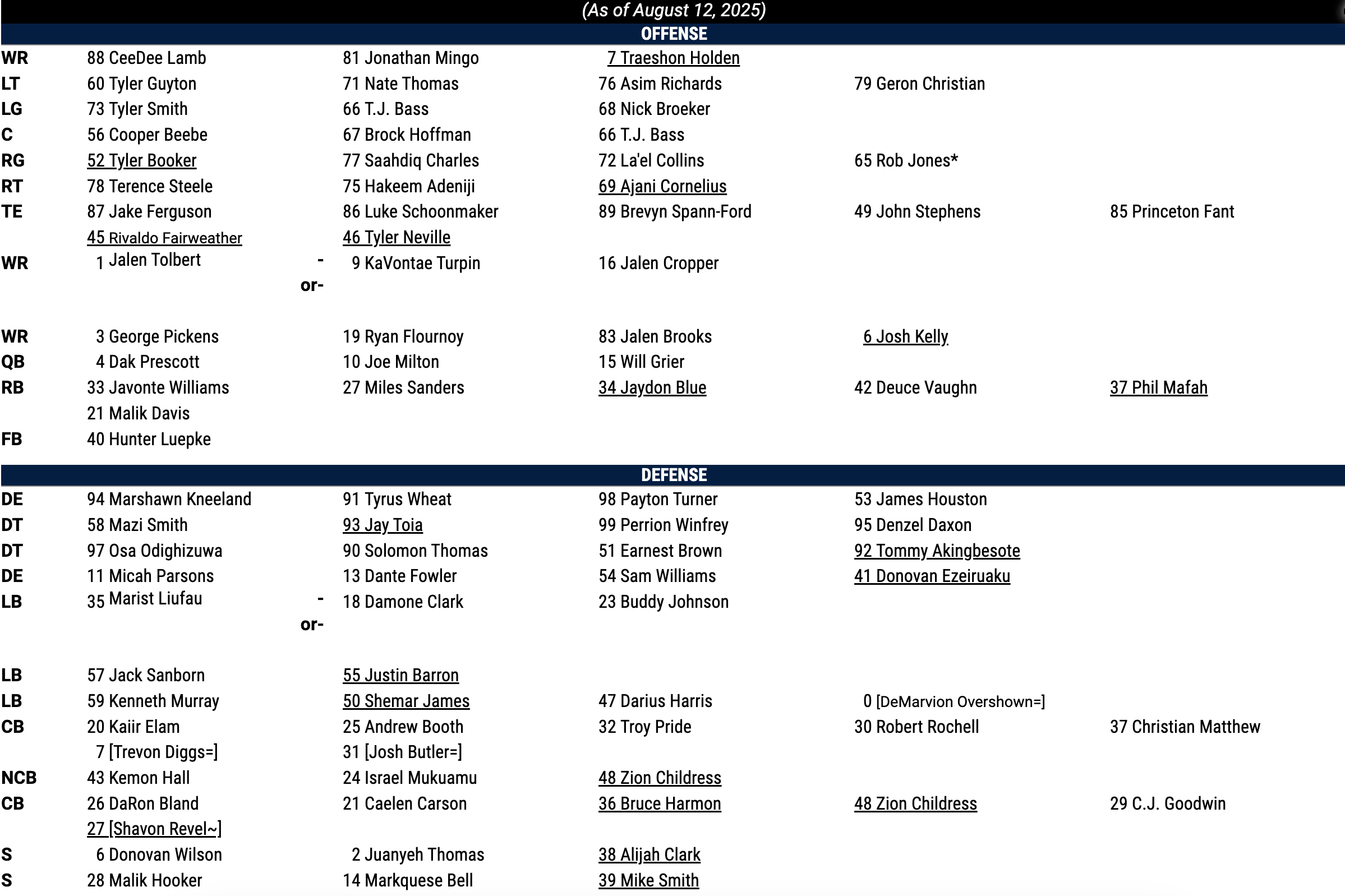 Dallas Cowboys release second unofficial depth chart of season
