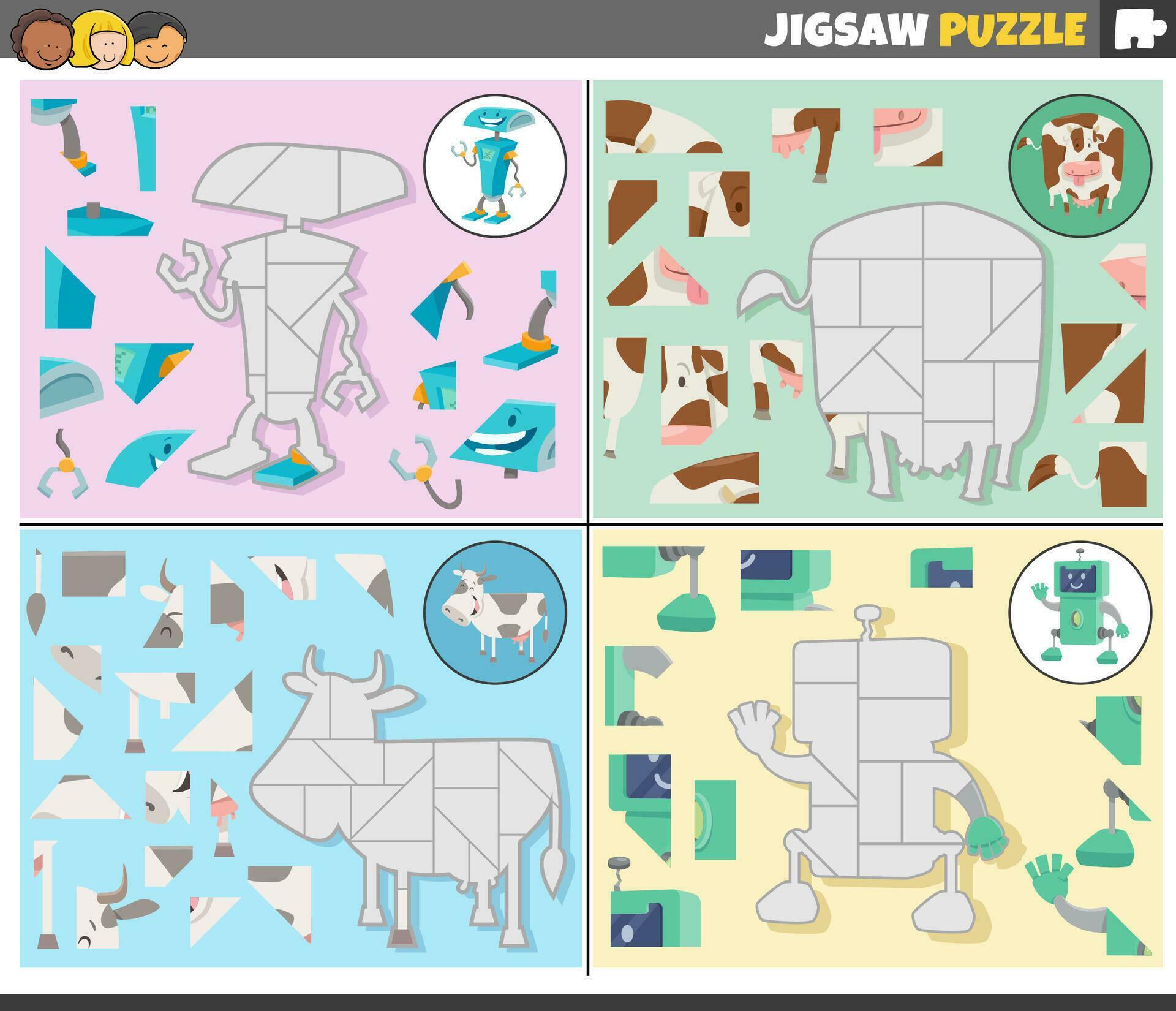 jigsaw puzzle games set with cartoon robots and cows 25384948 Vector