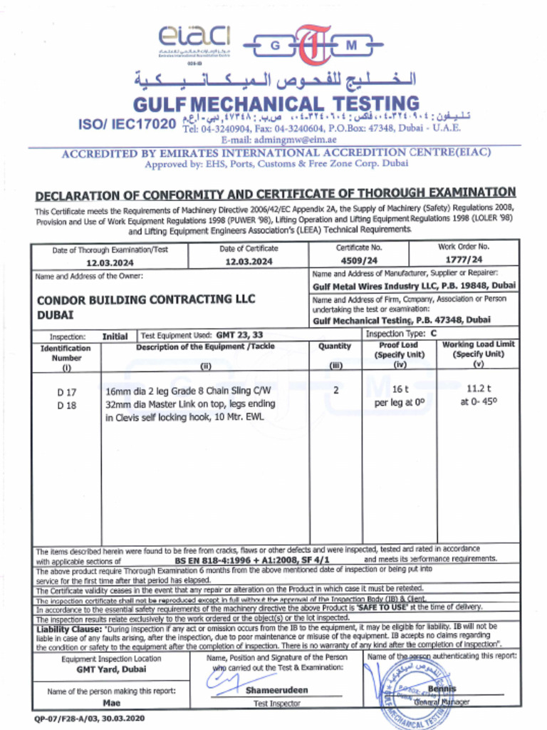 Certificate of Lifting Equipment Test: Document Certifying Inspection
