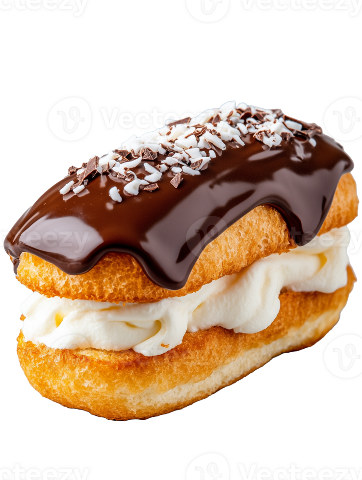 Chocolate cream filled pastry with coconut flakes on transparent