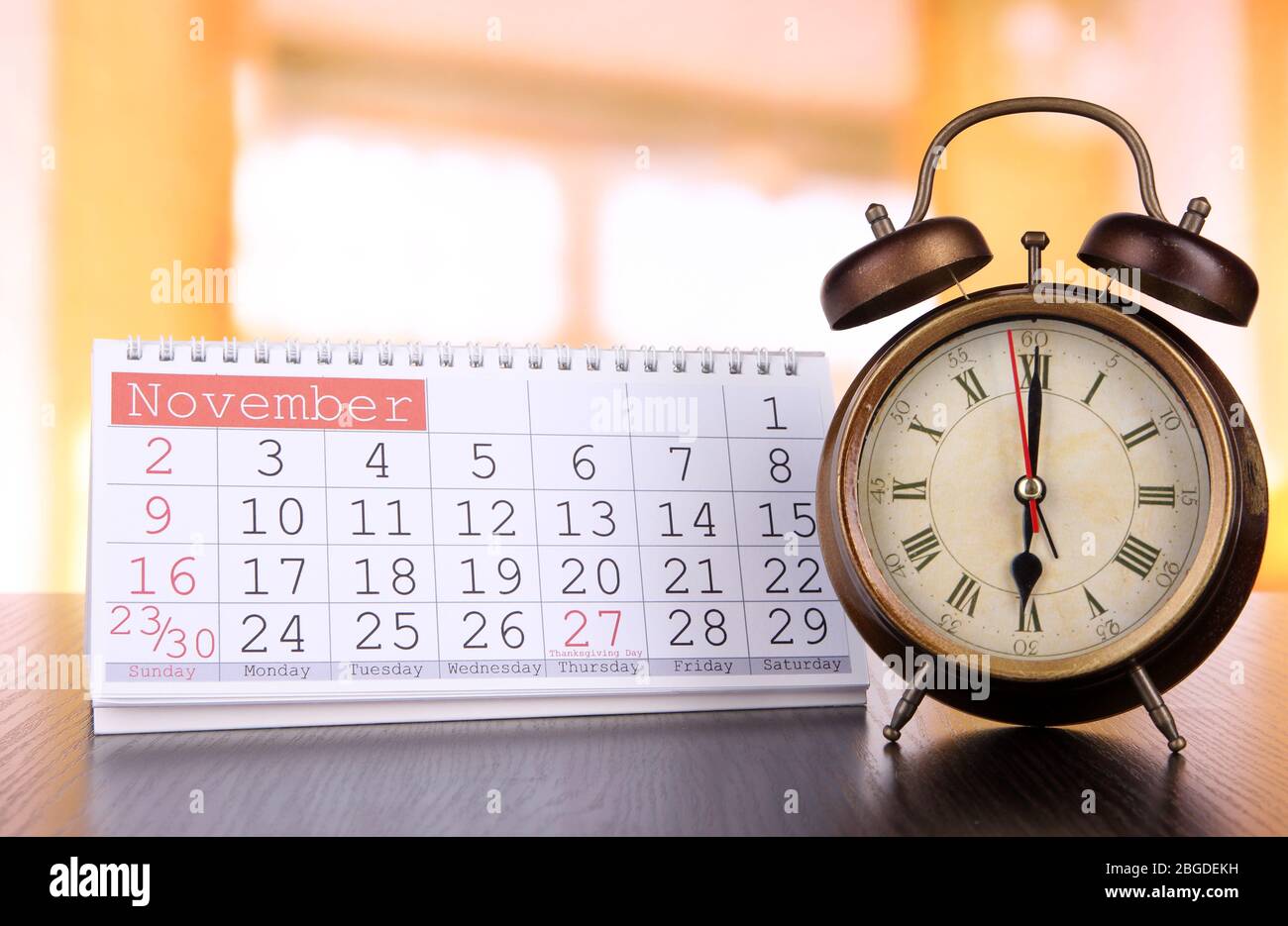 Alarm clock and calendar on bright background Stock Photo Alamy