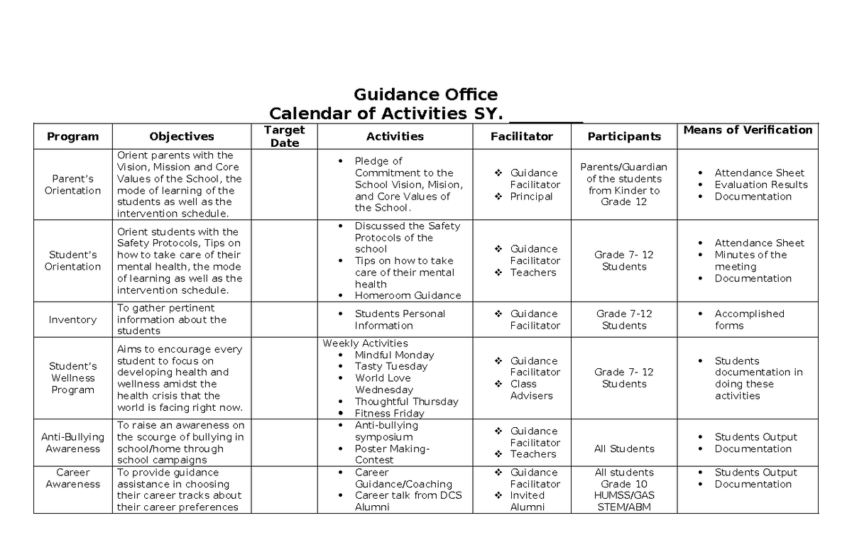 Guidance Office Calendar of Activities SY: Program Objectives Events