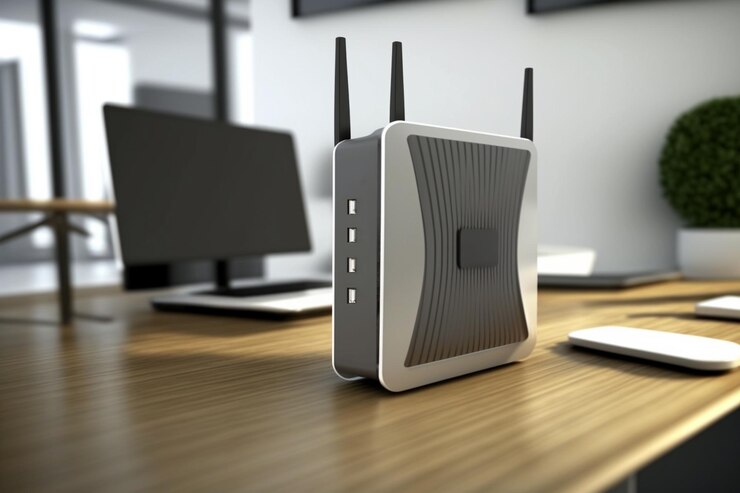 A Modern High speed Wireless Router Artfully Showcased on a Wooden