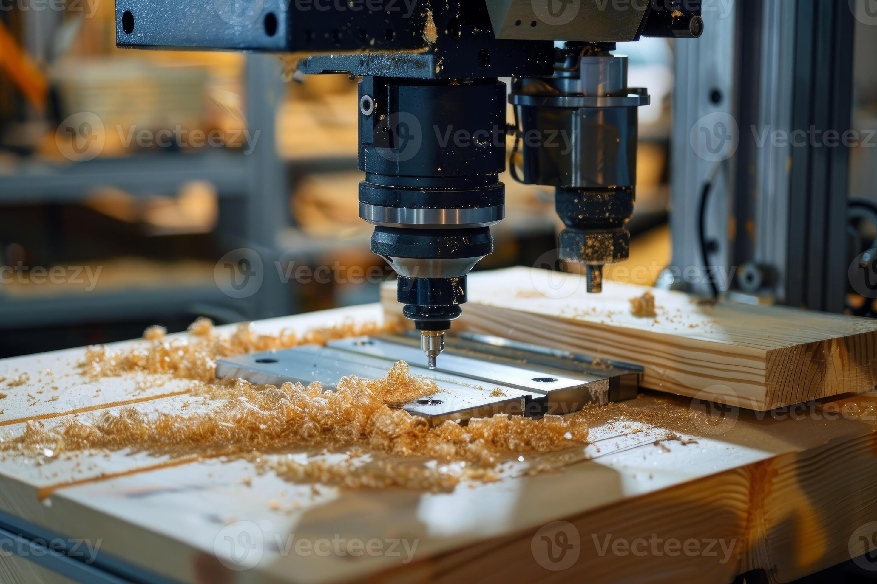 Cnc wood router creating sawdust while cutting wooden plank 52600848