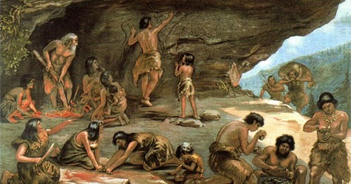 (primal scene) early humans living in a cave (some