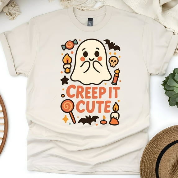 Creep It Cute Graphic Tee Funny Ghost Candy Cartoon Shirt Natural