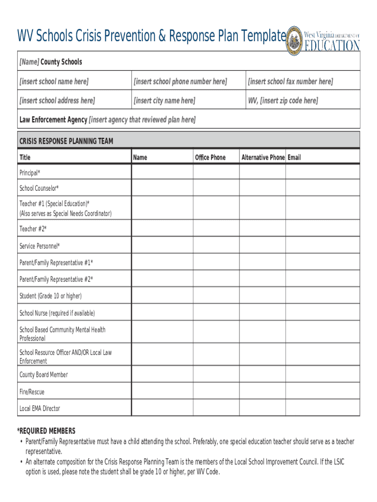 WV Schools Crisis Prevention Response Plan Template Doc Template