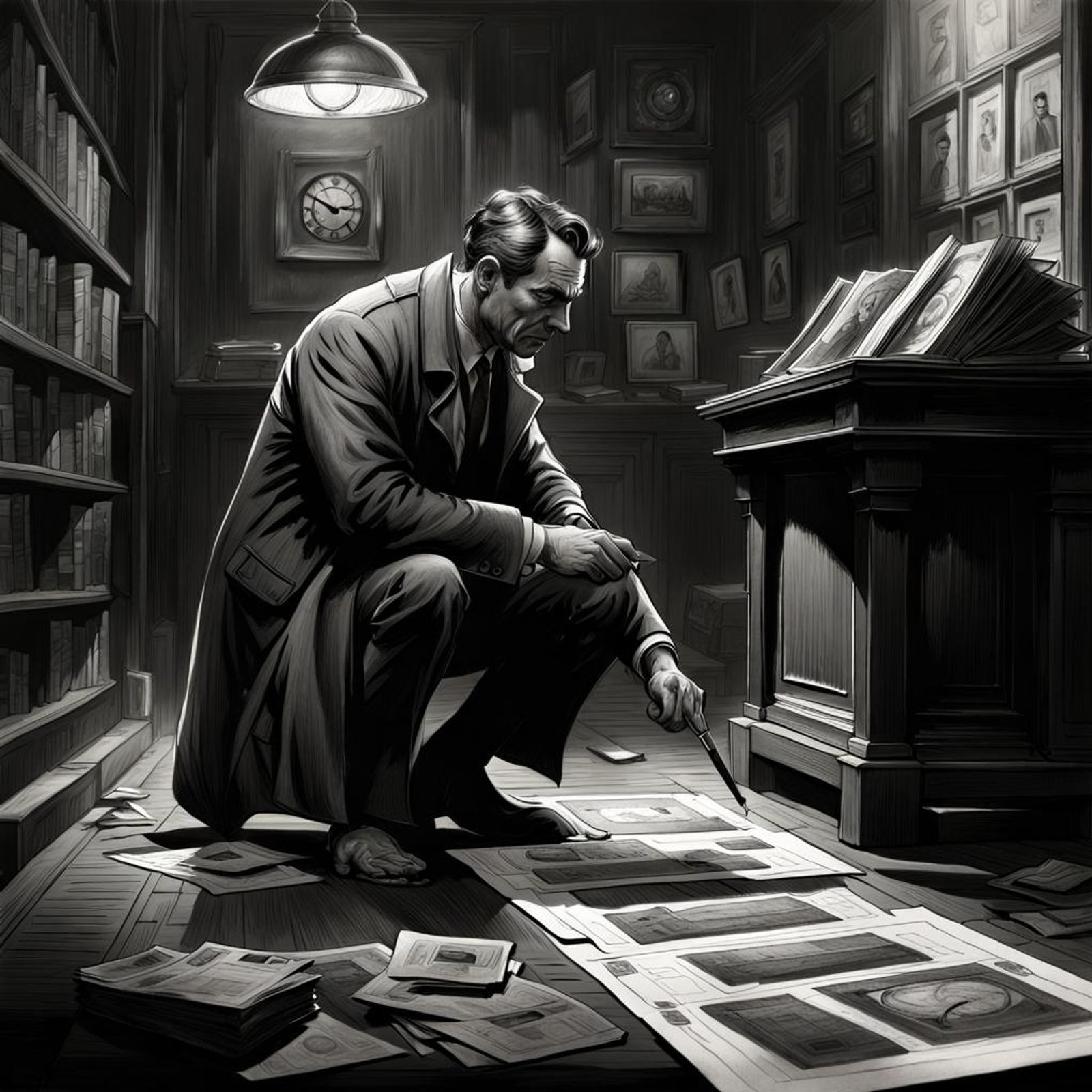 Detective crouching examining a clue /sombre mystérieux intriguant