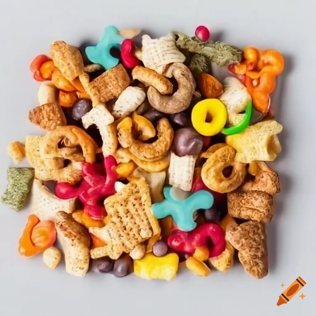 Puzzle shaped snack mix with a crunchy texture on Craiyon