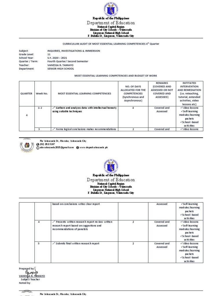 CURRICULUM AUDIT Q3 G 10 Bugetted Lesson PDF Science Mathematics