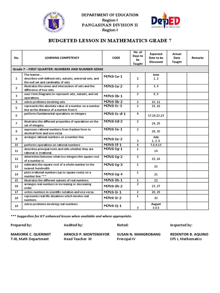 CURRICULUM AUDIT Q1 G 7 Bugetted Lesson PDF Numbers Real Number