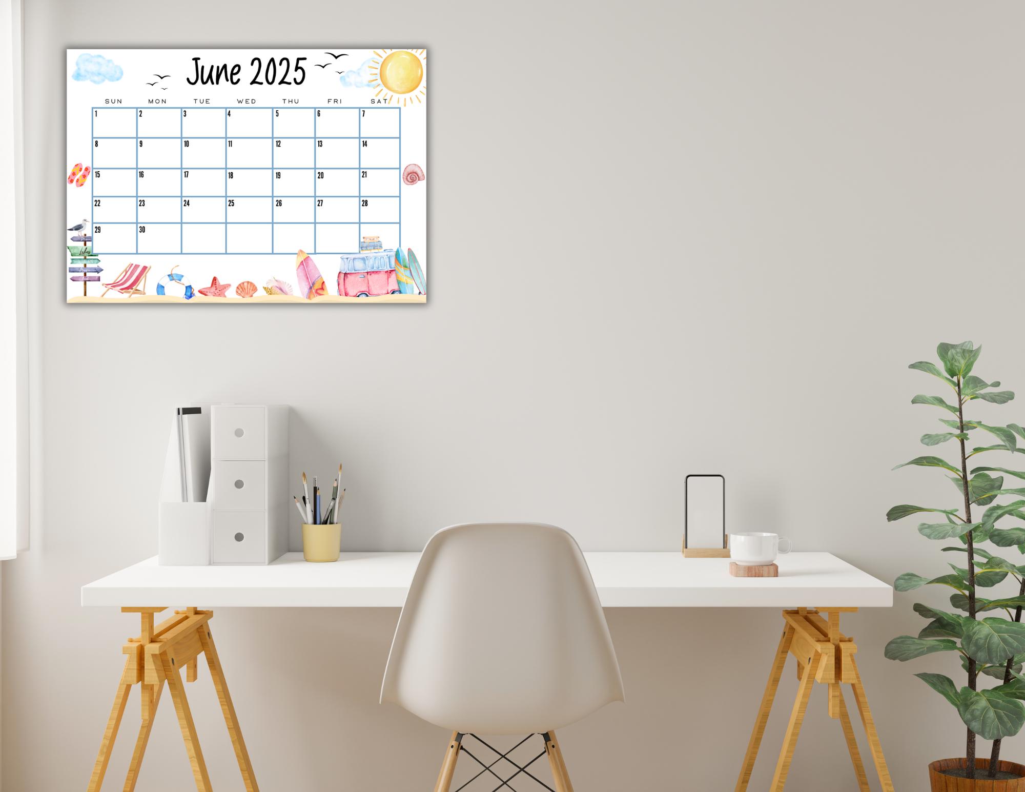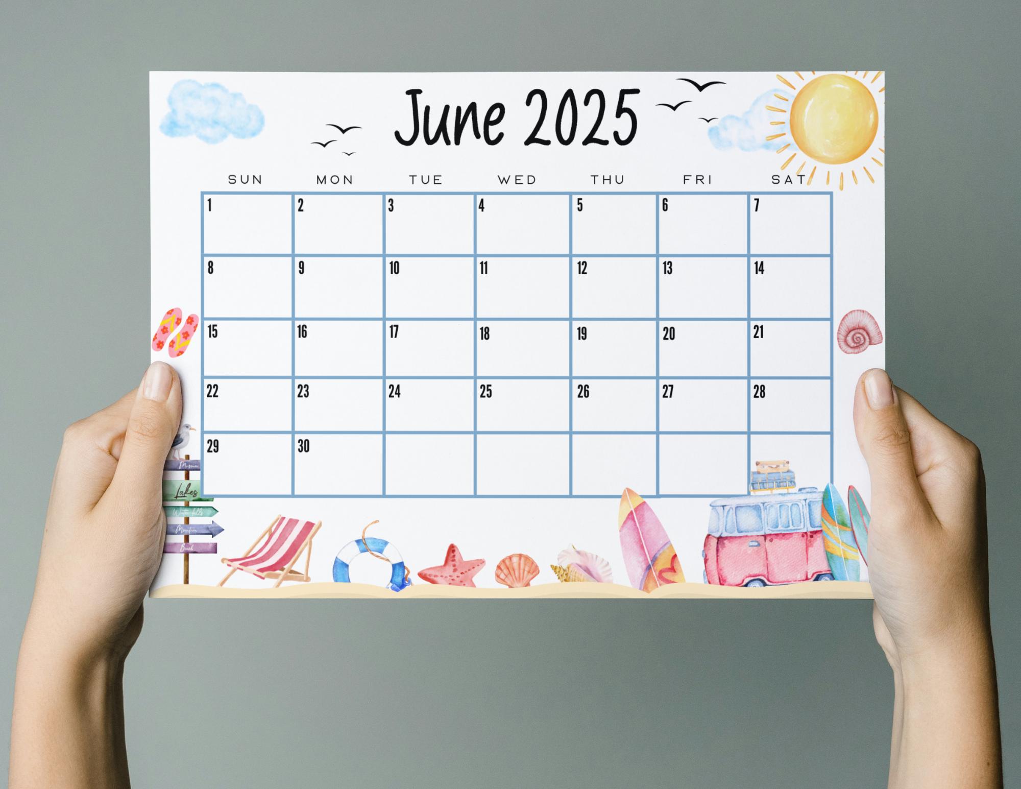 EDITABLE June Calendar 2025 Cute Summer Calendar W/ Beach Truck and