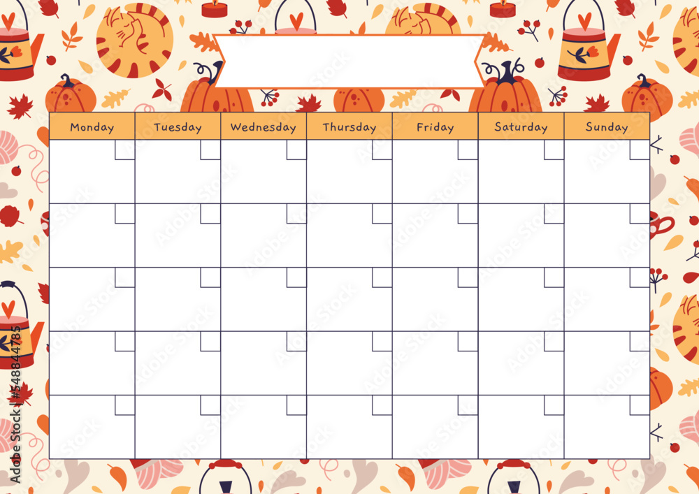 Cute monthly calendar template with cozy autumn background cartoon