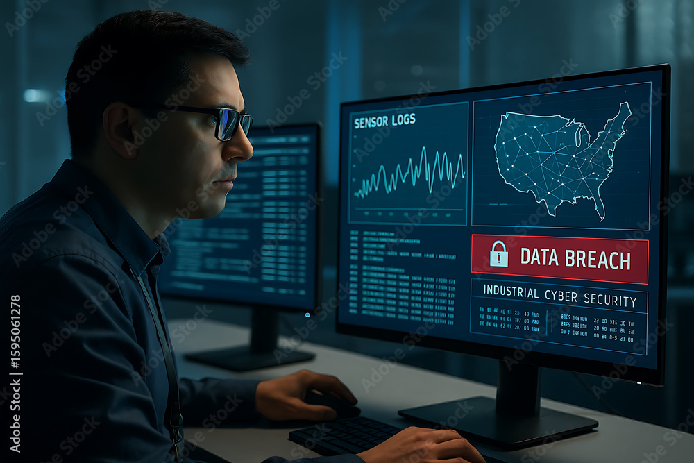 industrial cybersecurity A man monitors cybersecurity data on multiple