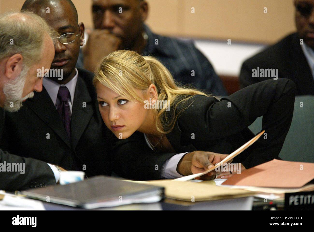 Tennis star Anna Kournikova listens to her attorneys Brian James