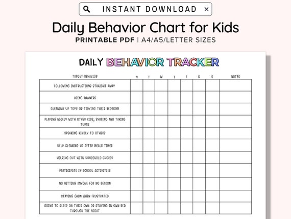 Printable Behaviour Chart For Kids Instant Download PDF A4 and US