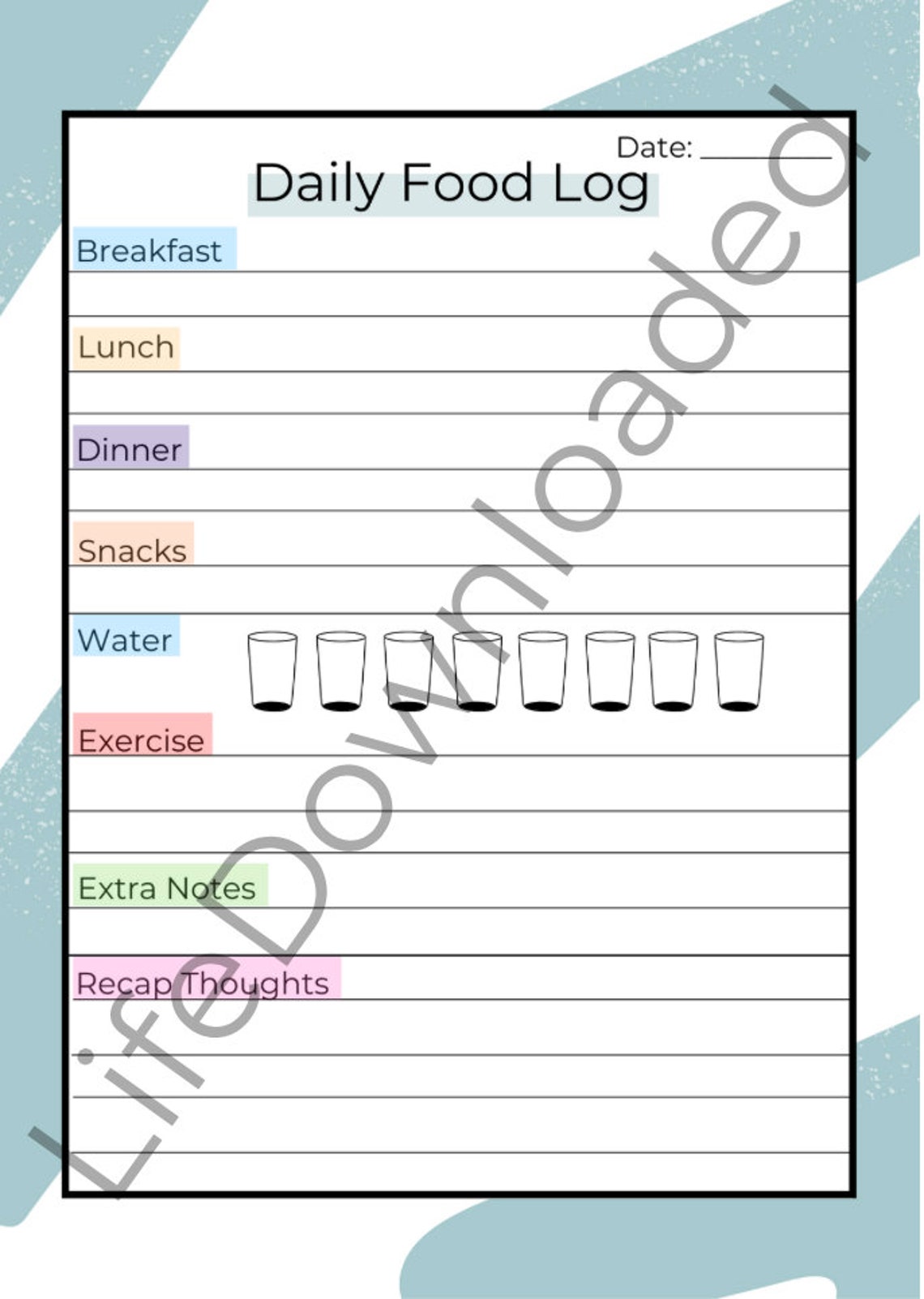 Daily Food Log / Diet Diary Printable Planner Letter Size 8 5 quot X 11