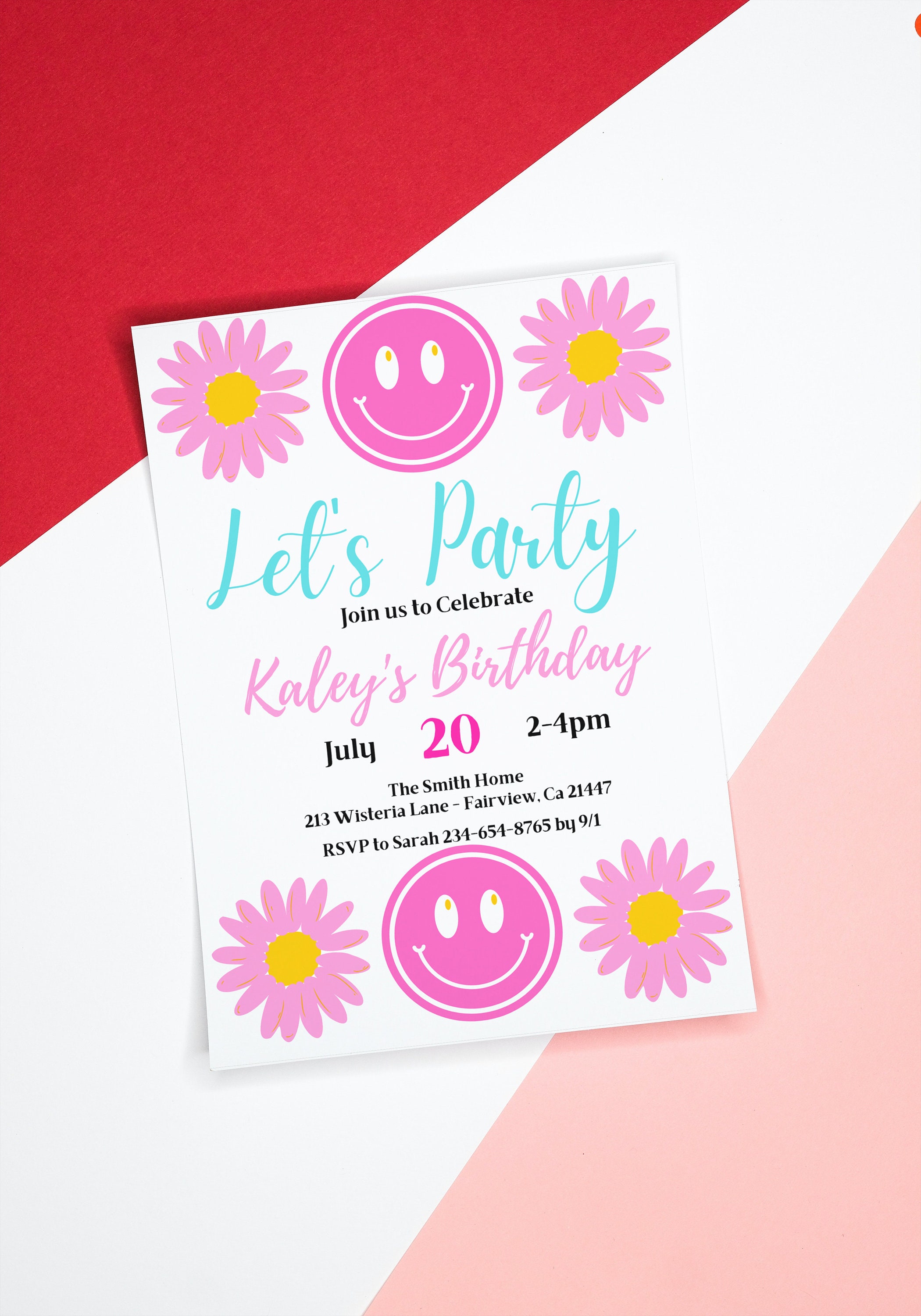 Editable Retro Pink Smile Face and Daisy Invitation Template Etsy
