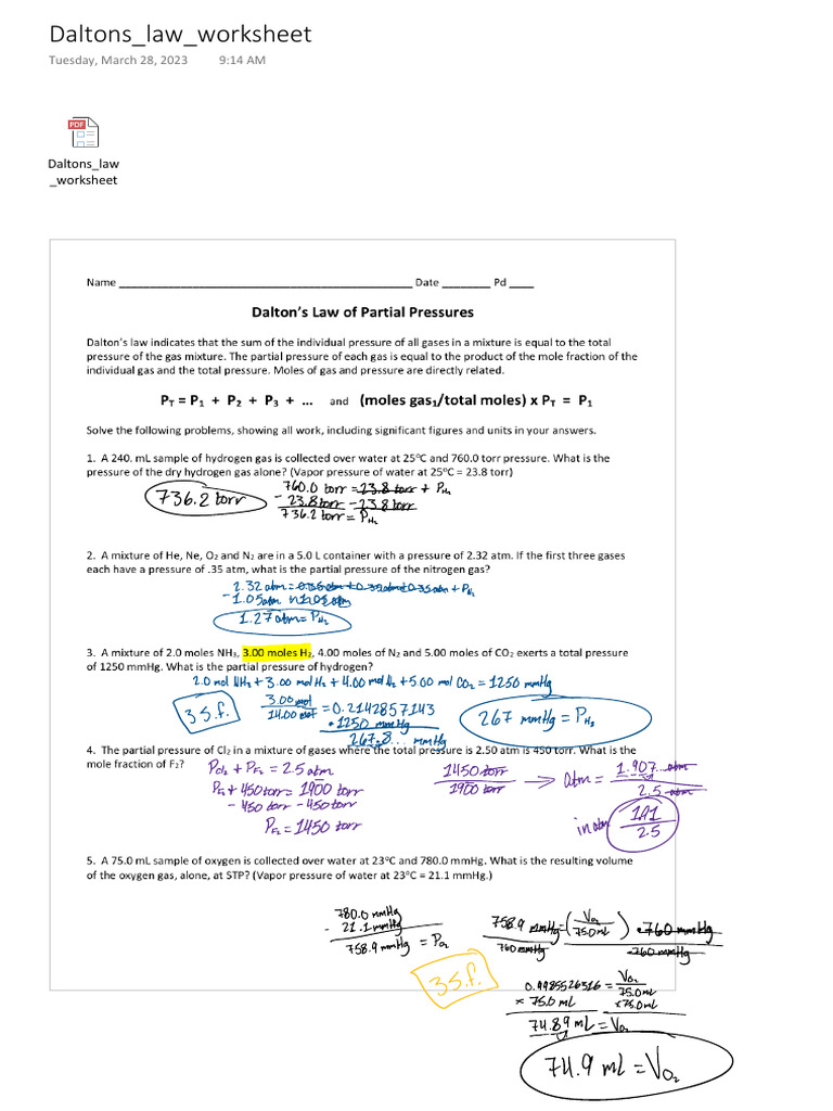 Chemistry Daltons Law of Partial Pressures Worksheet Set With Detailed KEY