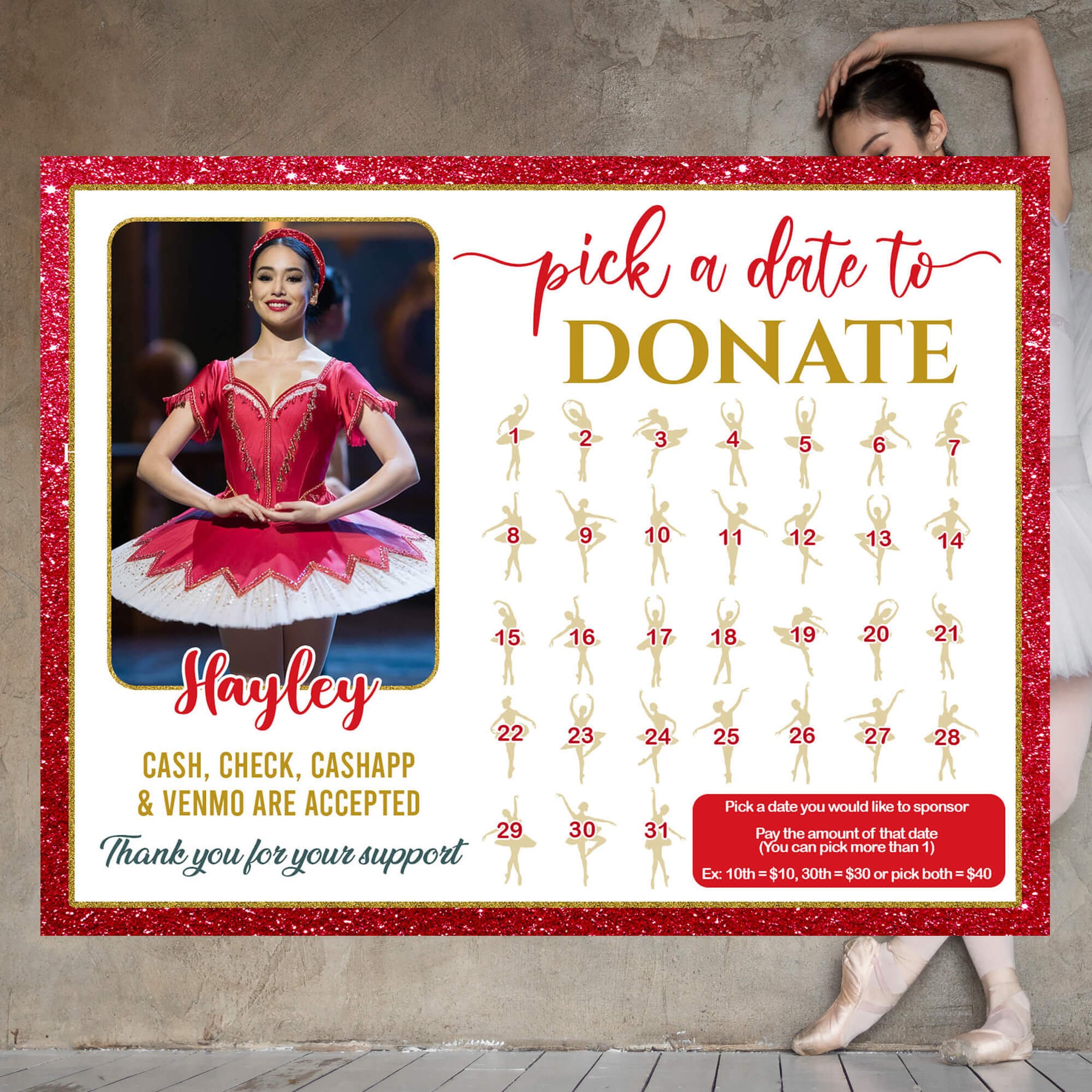 Editable Dance Fundraising Calendar Ballerina Pick a Date to Donate