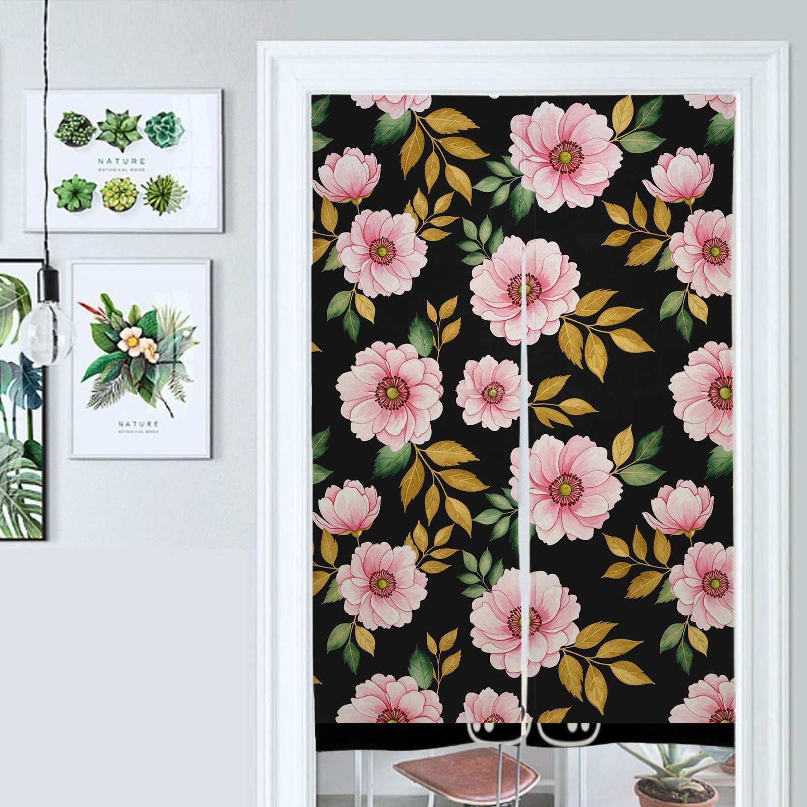 Pink Flowers Gold Leaves Dark Background Door Curtain Nordic Living