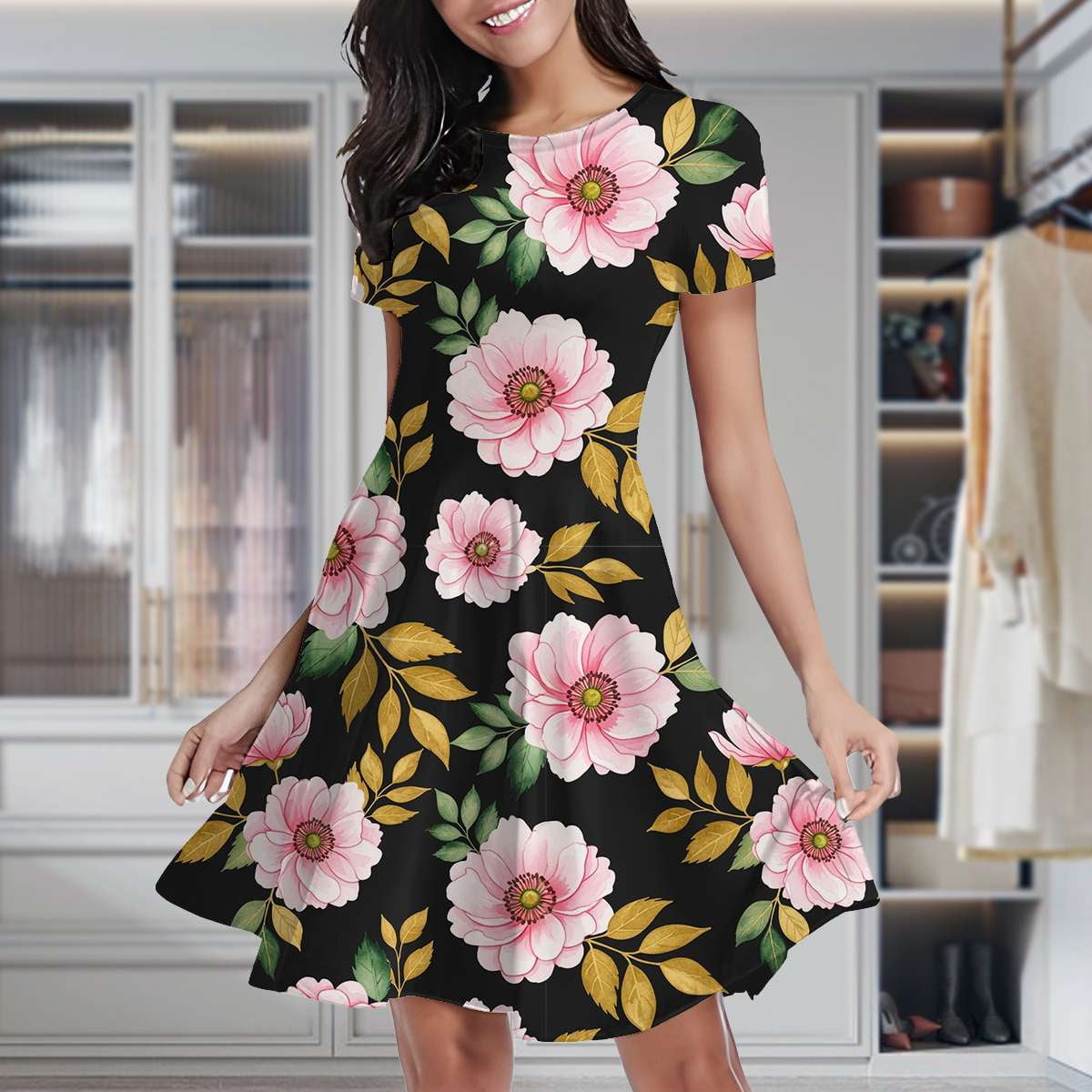 Pink Flowers Gold Leaves Dark Background Women #39 s Classic Swing Skater