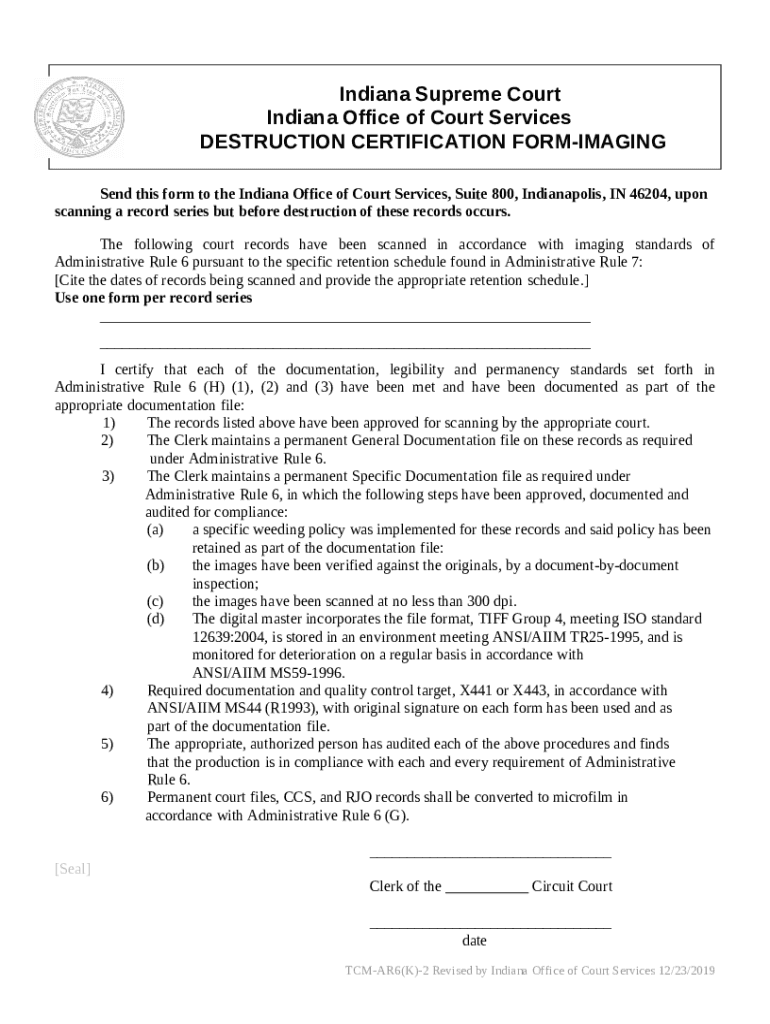 DESTRUCTION CERTIFICATION Indiana Doc Template pdfFiller