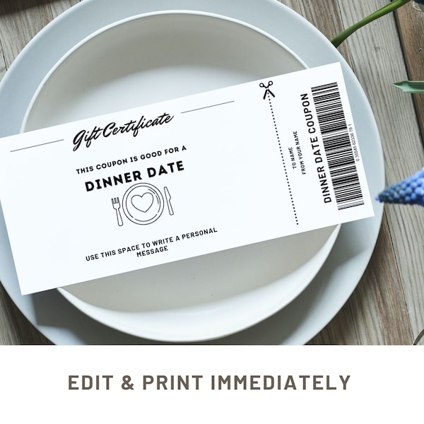 Dinner Reservation Gift Voucher Editable Dinner Date Coupon Dinner